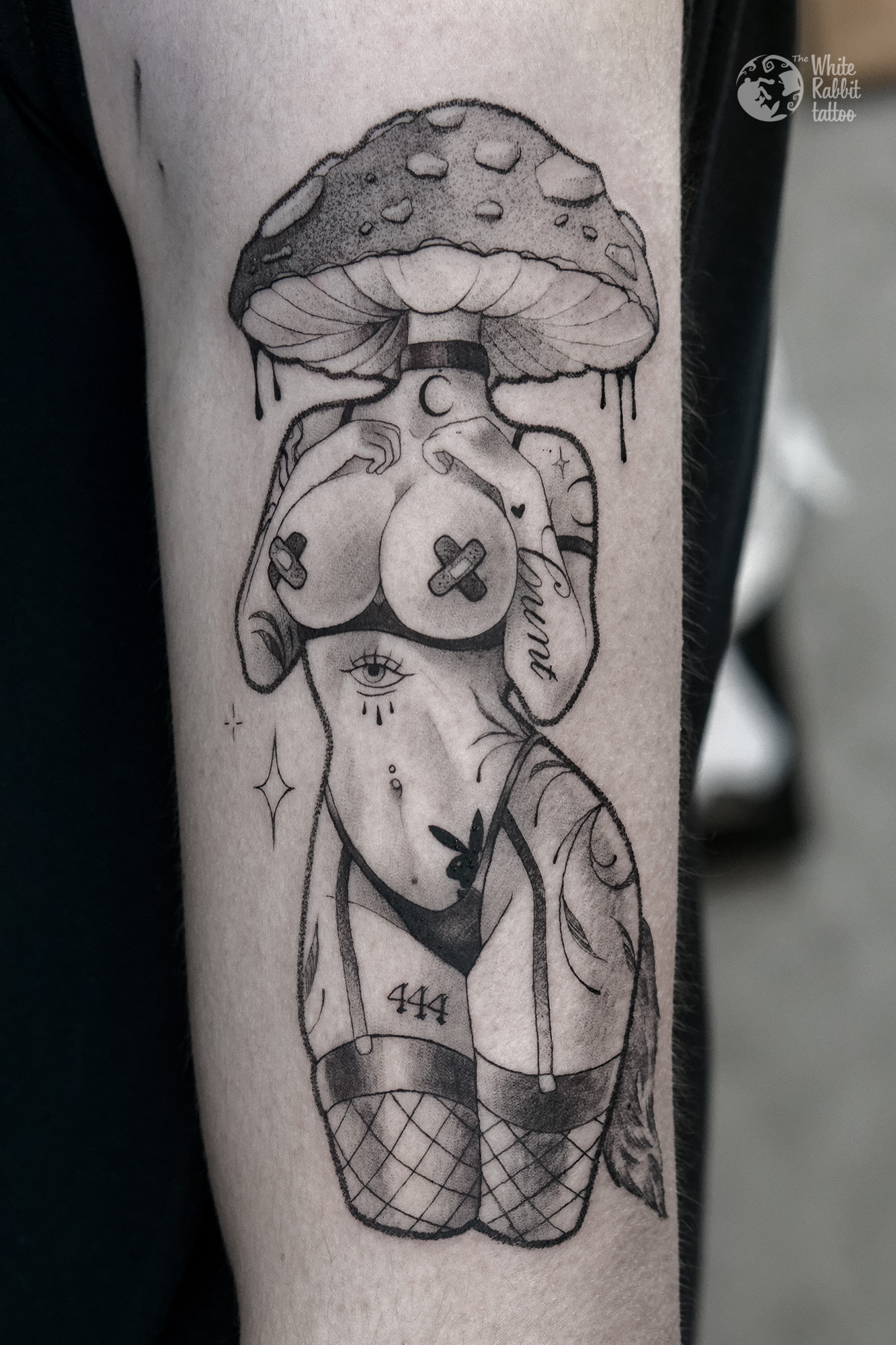 Ostatnie miesiące były bardzo udane pod względem wzorów, które przygotowałam. Rzadko upraszczam sobie pracę zakrywając detale czarnym tuszem. Niemniej ostatnio chętniej korzystam z możliwości lokalnego przyciemnienia grafiki, by uzyskać mocniejsze kontrasty. No cóż tatuaże rządzą się swoimi prawami i mój styl ewoluuje z czasem. Troszkę rozszalałam się z projektami, które często mogłyby stanowić zawartość dobrego komiksu lub ilustrację książki. Ciężko mi wybrać coś najlepszego ale na pewno robi robotę żabi mistrz nazwany Kulfonem, z ultra drobiazgowym delikatnym cieniowaniem. Na sesję przygotowałam dwa warianty tatuażu. Na pierwszej propozycji żabia postać przysiada na gałęziach, na drugiej niemal lewituje korzystając z mistrzowskiego kija, na wzór mistrzów klasztoru Shaolin. Jest jeszcze tatuaż kobieta grzyb z mikro tatuażami. To całkiem jak rosyjska babuszka niespodzianka, tudzież incepcja czyli tatuaż w tatuażu.